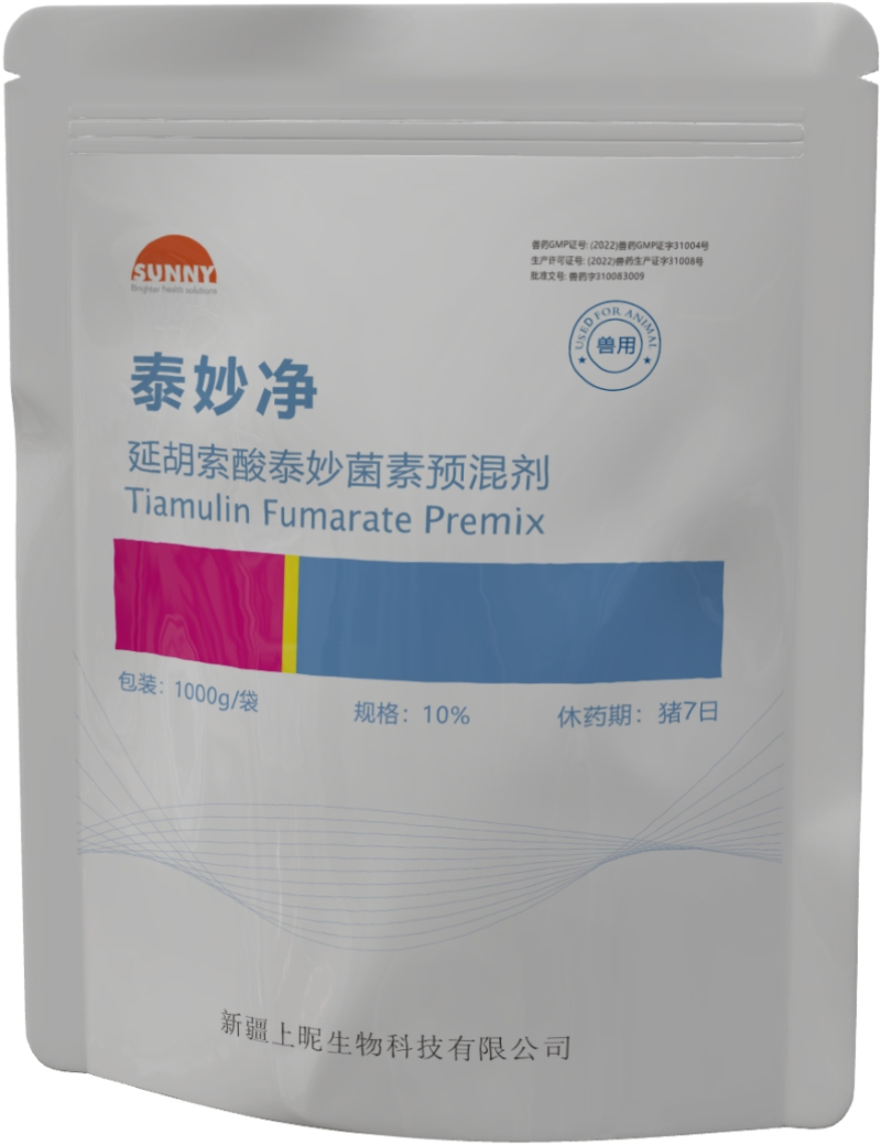 延胡索酸泰妙菌素10%预混剂 主要用于防治猪支原体肺炎、猪放线杆菌胸膜肺炎,也用于密螺旋体引起的猪痢疾。 以本品计,每1000kg饲料,猪400~1000g,连用5~10日。 猪7日。